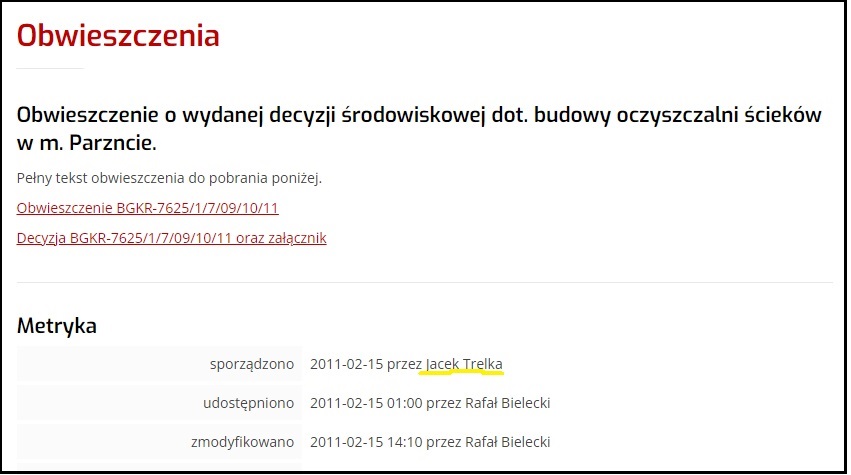 W dniu 15 lutego 2011 r. piszący te słowa Jacek Trelka (nie mylić z Waldemarem) – ówczesny kierownik referatu Rolnictwa i Ochrony Środowiska Urzędu Gminy Kowala – opublikował decyzję o środowiskowych uwarunkowaniach dla budowy oczyszczalni ścieków w Parznicach.